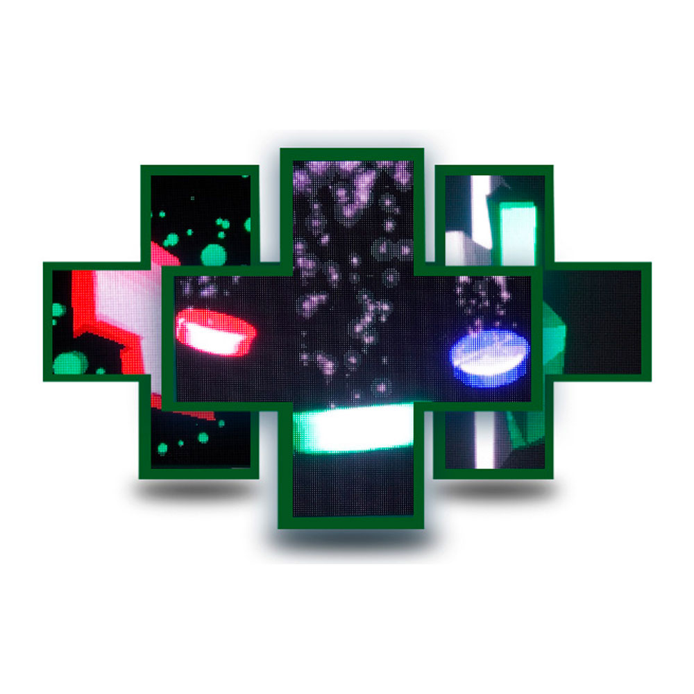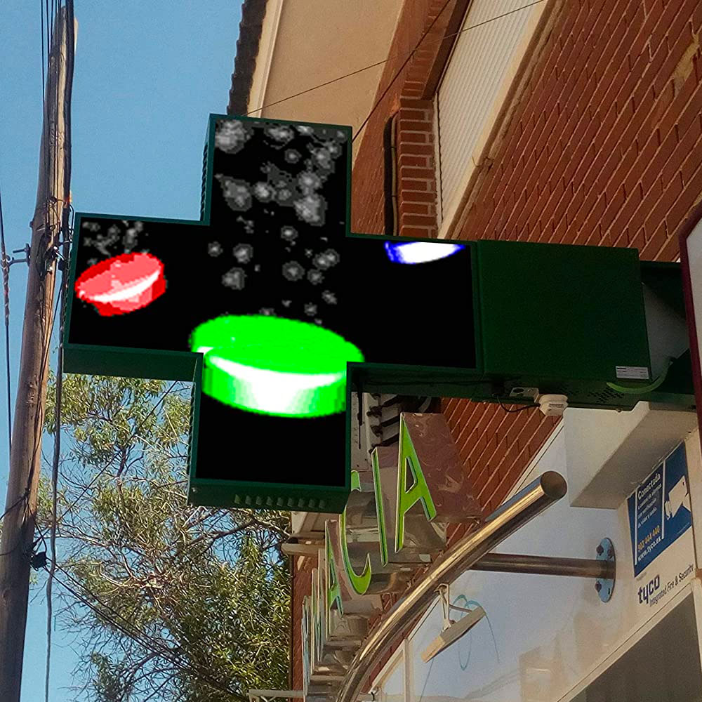 Por otra parte, la cruz de farmacia pantalla LED Orion dispone de un control remoto que permite al farmacéutico controlar el encendido y apagado de la cruz, ponerla en modo día o modo noche y controlar el brillo. Expofarm, empresa de equipamiento, pone a prueba todas sus cruces de farmacia bajo estrictos criterios de calidad que garanticen su funcionamiento y su resistencia antes de ponerlas a disposición de sus clientes. Además, después de la venta, Expofarm crea un compromiso de garantía y calidad con el cliente. /// Características de la cruz de farmacia pantalla led Orion. Dimensiones: 120 x 120 cm Pixel Pitch: 6mm Leds: 40.960 Tipo de led: SMD Nivel de protección: IP65 – Impermeable Animaciones: Animaciones 2D y 3D, video, foto, texto, hora, temperatura, humedad relativa. Brillo automático Textos superpuestos en escenas Con control remoto Conectividad de la pantalla: TCP/ IP; WIFI